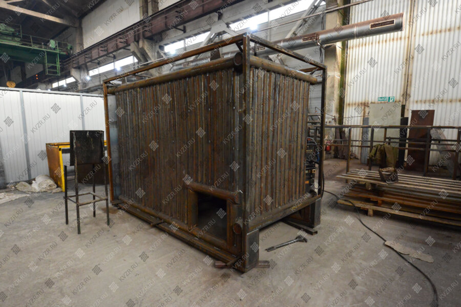 Блок водонагревательного котла КВм 1,25 МВт представляет собой горизонтальную стальную сварную конструкцию, состоящую из трубной системы (радиационной и конвективной поверхности нагрева), опорной рамы и каркаса с теплоизоляционными материалами, обшитого листовой сталью. Топочная камера состоит из труб Ø 57x3,5 мм. Конвективная поверхность нагрева состоит из пакетов выполненных из труб Ø 32x3 мм, для интенсификации теплообмена трубы пакетов расположены в шахматном порядке.