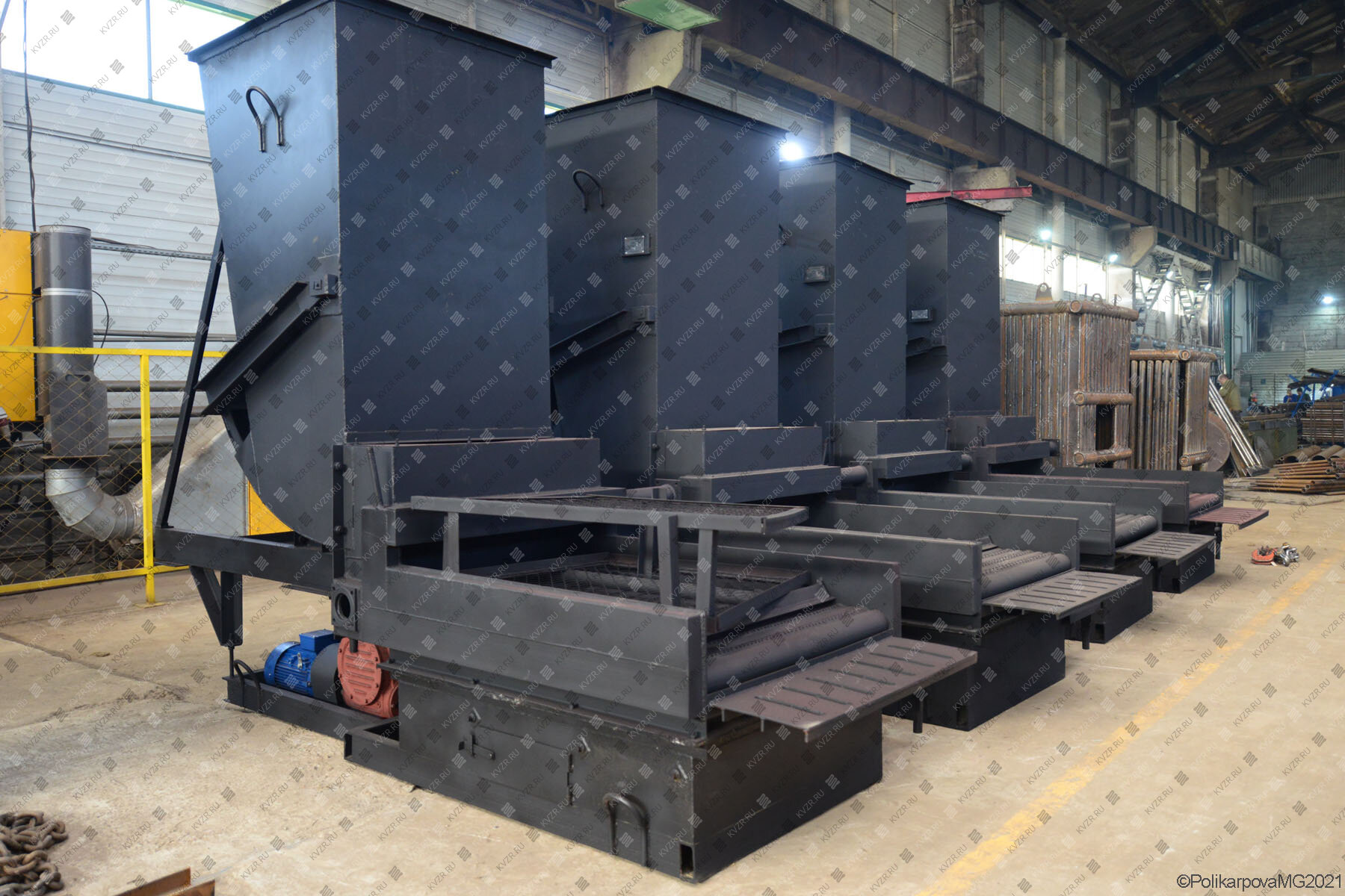 Топки механические с ленточной цепной решеткой прямого хода ТЛПх предназначены для сжигания каменных и бурых углей в паровых и водогрейных котлах КВм мощностью до 4 МВт, а также промышленных печах. В топках за счет движения колосникового полотна происходит непрерывная подача топлива из угольного ящика в топочную камеру и удаление шлака. Топка ТЛПХ отличается верхним зажиганием, горение происходит в толстом слое топлива.